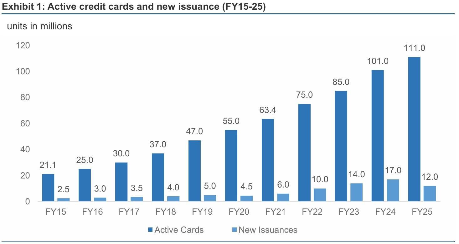 उदाहरण के लिए, आइए क्रेडिट कार्ड लें: हाल के वर्षों में स्वीकृत कार्डों की संख्या में लगातार वृद्धि हुई है। FY12 से FY25 तक एक्टिव क्रेडिट कार्ड की संख्या सामने आई है 5xऔर दिसंबर 2024 के अंत तक यह ख़त्म हो गया सौ करोड़ भारत में क्रेडिट कार्ड सक्रिय करें।