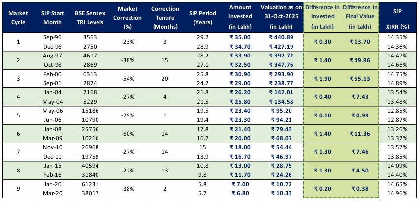 लंबी अवधि में, इन दोनों परिदृश्यों के बीच रिटर्न में अंतर आश्चर्यजनक रूप से छोटा है। एक्सआईआरआर (विस्तारित आंतरिक रिटर्न दर, वार्षिक रिटर्न, मूल रूप से) समान स्तरों पर एकत्रित होता है, भले ही निवेश यात्रा चक्र के ऊपर या नीचे से शुरू हुई हो। लगातार निवेश का चक्रवृद्धि प्रभाव धीरे-धीरे खराब प्रवेश बिंदु के शुरुआती नकारात्मक पहलू पर भारी पड़ता है।