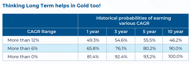 जून 1999 से अगस्त 2025 तक के ऐतिहासिक आंकड़ों से पता चलता है कि सोने में 10 साल के रोलिंग एसआईपी ने 90% मामलों में 6% से अधिक का एक्सआईआरआर प्राप्त किया है। सबसे महत्वपूर्ण बात यह है कि 10-वर्षीय एसआईपी में से किसी ने भी 26-वर्ष की अवधि में नकारात्मक रिटर्न नहीं दिया है।