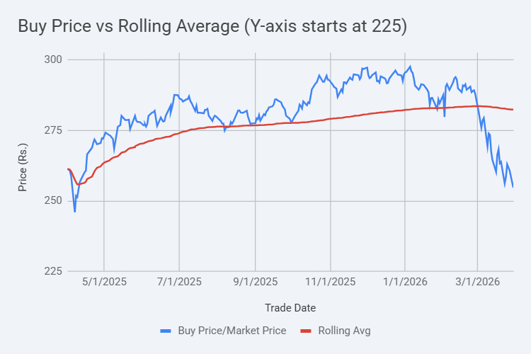 पिछले वर्ष (1 अप्रैल, 2025 से 1 अप्रैल, 2026 तक) मैंने बाजार का समय जानने की कोशिश किए बिना हर दिन एक निफ्टी ईटीएफ (निफ्टीबीज़) खरीदा। परिणामस्वरूप, मैंने 249 ट्रेडिंग सत्रों में लगभग ₹70,000 का निवेश किया। और मेरी औसत खरीद कीमत लगभग ₹282 प्रति यूनिट थी, जबकि 1 अप्रैल, 2026 को कीमत ₹255 के करीब थी। कागज पर, इसका मतलब लगभग ₹6,900 का नुकसान है।