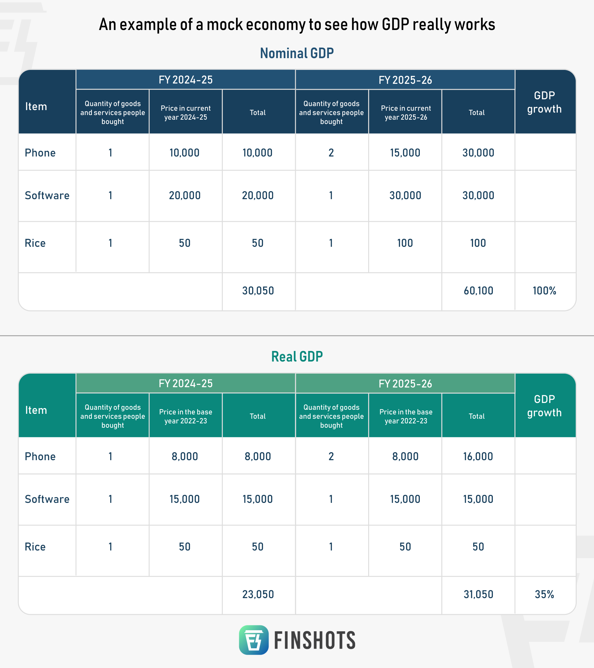 पहला, नॉमिनल जीडीपी, जिसके बारे में हम पहले ही बात कर चुके हैं। यहां आप वित्त वर्ष 2015 में उत्पादित मात्रा लेते हैं और इसे उसी वर्ष की कीमतों से गुणा करते हैं। तो कल्पना करें कि FY25 में, काल्पनिक रूप से, लोग 1 फ़ोन ₹10,000 में, 1 सॉफ़्टवेयर लाइसेंस ₹20,000 में और 1 किलो चावल ₹50 में खरीदते हैं। कुल नाममात्र जीडीपी ₹30,050 होगी। अब FY26 में, मान लीजिए कि लोग 2 फ़ोन प्रत्येक ₹15,000 में खरीदते हैं, 1 सॉफ़्टवेयर लाइसेंस ₹30,000 में और 1 किलो चावल ₹100 में खरीदते हैं। नाममात्र जीडीपी बढ़कर ₹60,100 हो गई।