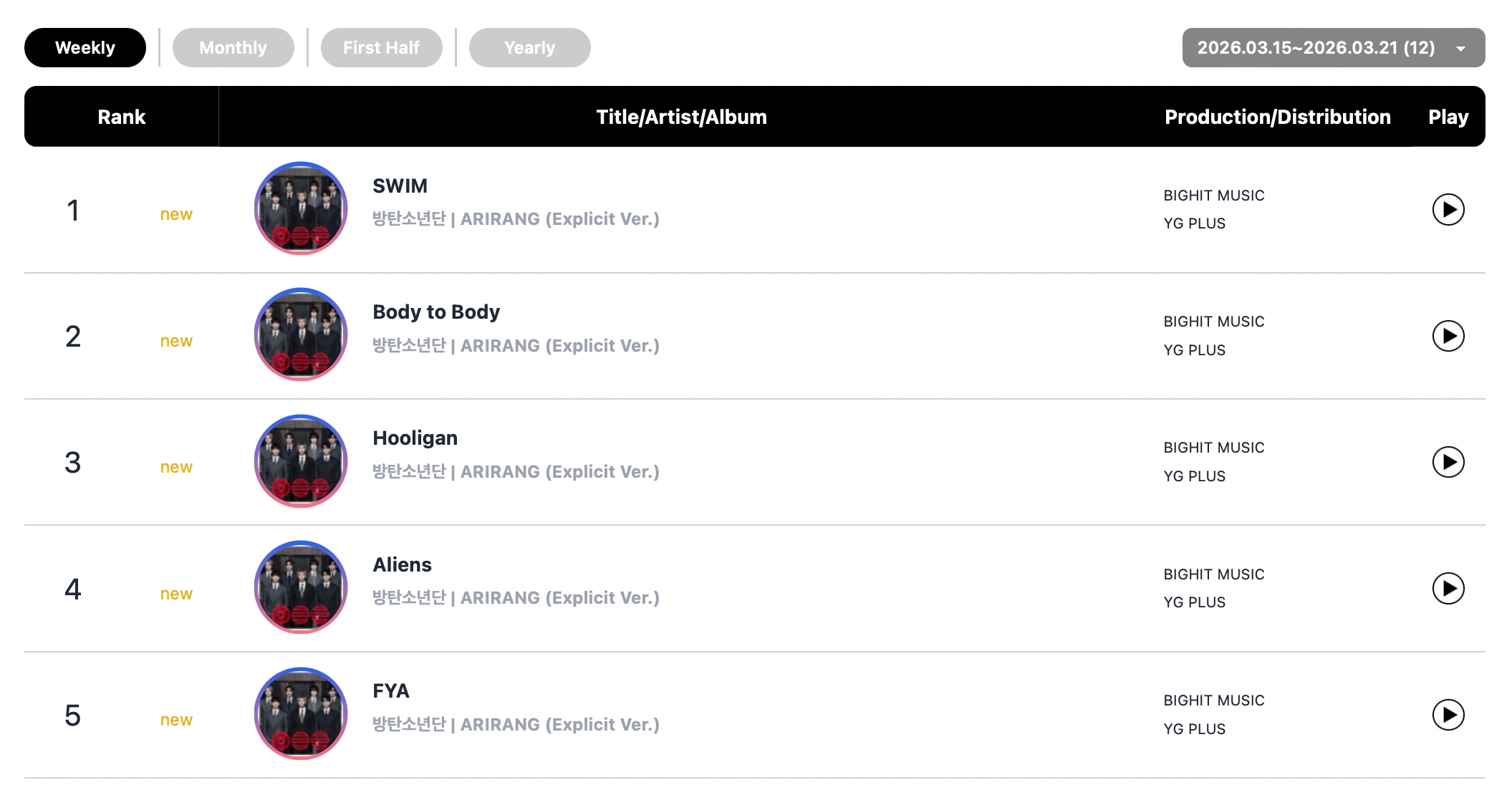 BTS also grabbed all of the top five spots on this week’s digital download chart with songs from “ARIRANG.” Their title track “SWIM” debuted at No. 1, followed by “Body to Body” at No. 2, “Hooligan” at No. 3, “Aliens” at No. 4, and “FYA” at No. 5.