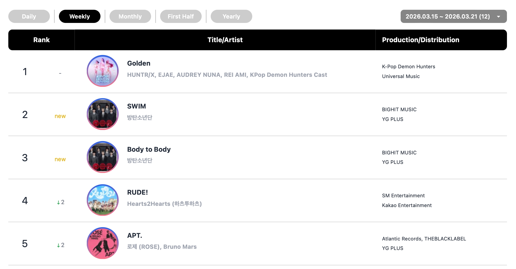 Hearts2Hearts’ “RUDE!” took number 4 for the week, while BLACK PINK‘s Rosé and Bruno Mars’ hit collaboration “APT.” rounded out the top five.