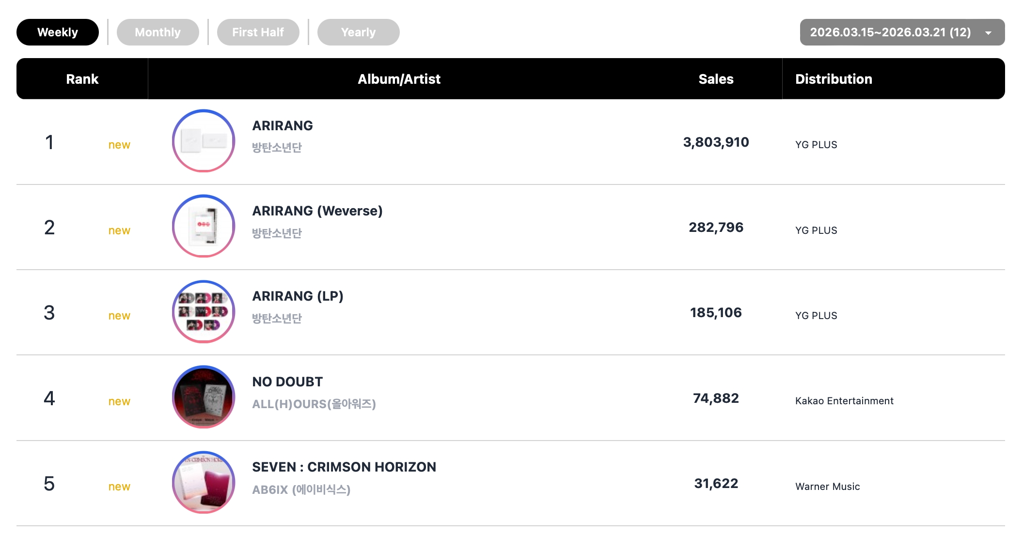 All of the top three spots on this week’s physical album chart went to BTS’ new album “ARIRANG”: the regular version of the album debuted at number 1, while the Weverse and LP versions charted separately at number 2 and number 3.