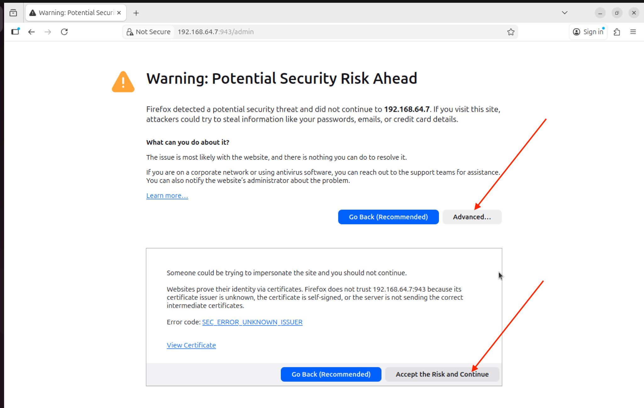 Copy the Admin UI address and paste it into the browser. It will give you a warning as it is a self-signed SSL certificate, so you need to click “Next” and then “Accept the risk and continue”.