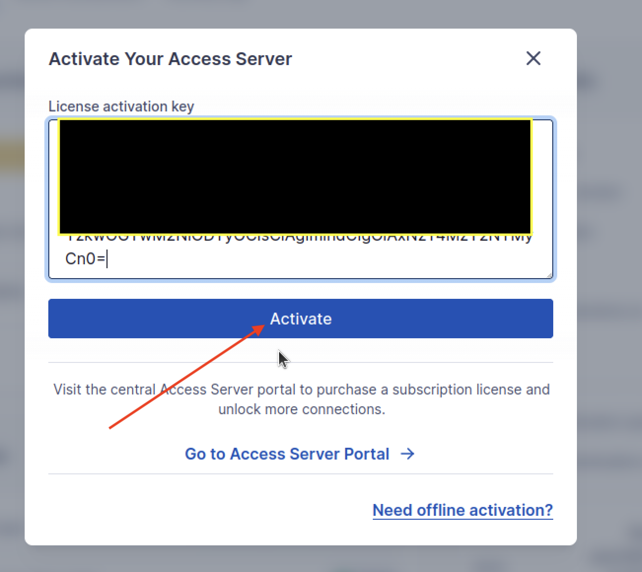 Come back to your Admin UI and paste the key in the same “Activation” tab pop-up window and click “Activate”: