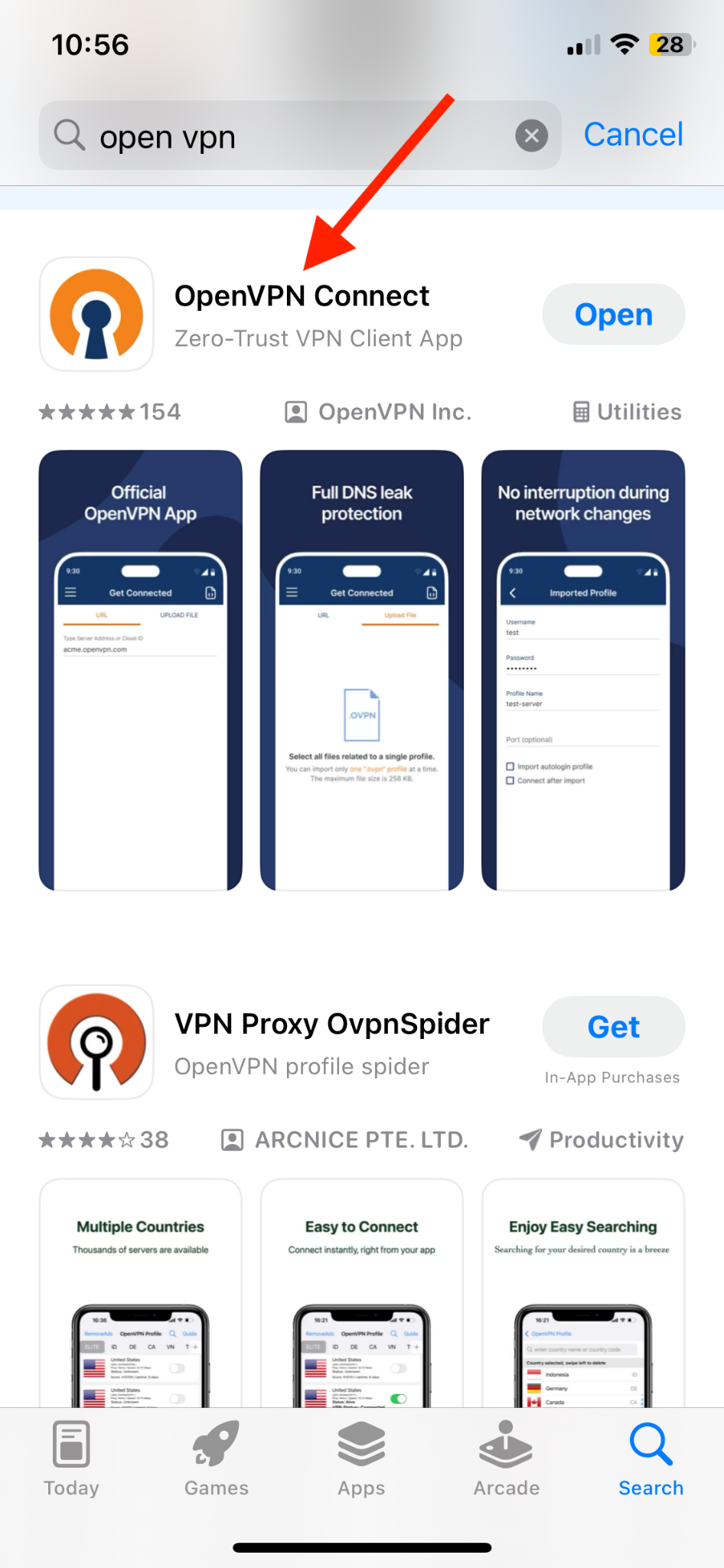 For this I quickly picked up my iPhone and searched for OpenVPN Connect and installed the app.