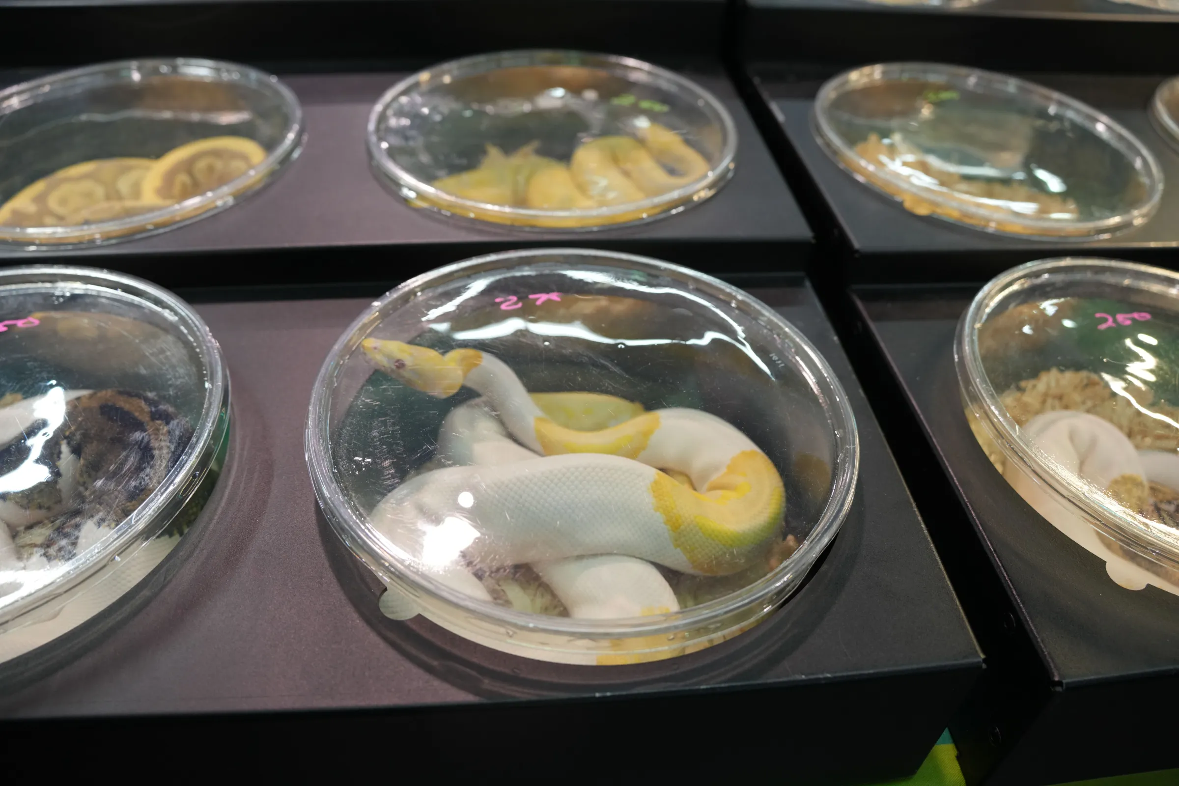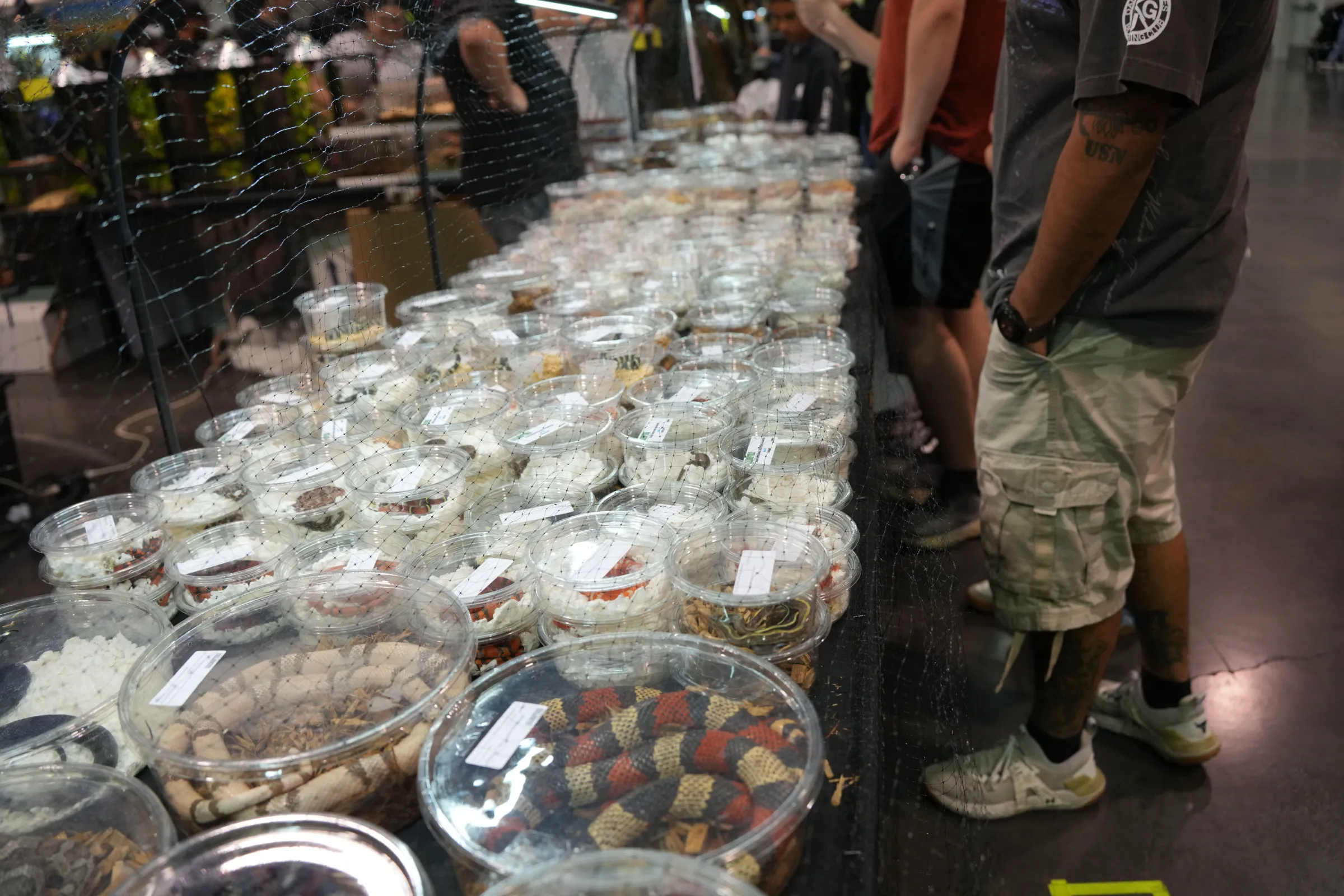 Dozens of snakes tightly packed into containers at the Reptile Super Show in California.