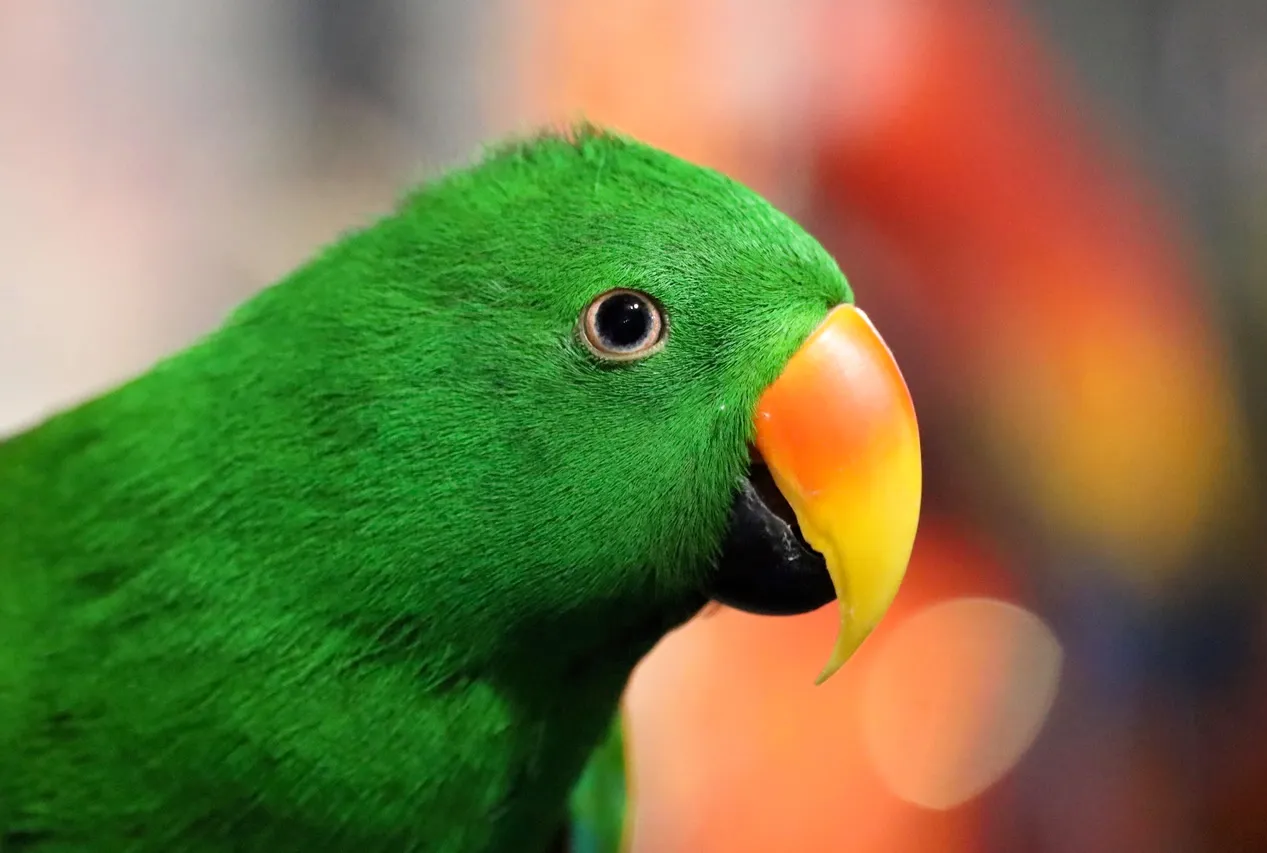 Mango, a rescued parrot living at Foster Parrots & The New England Exotic Wildlife Sanctuary in Rhode Island.