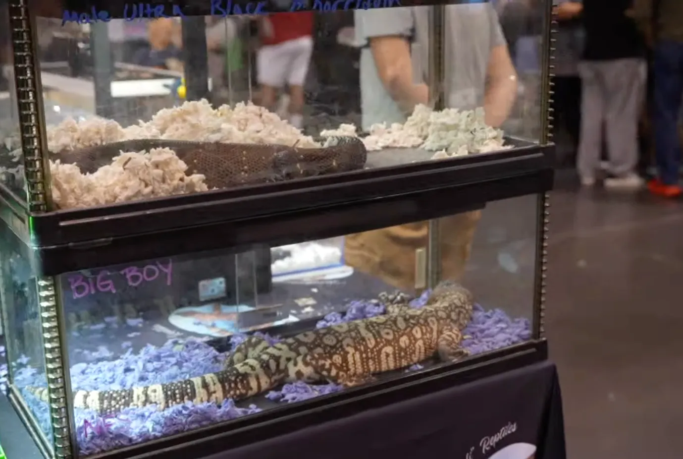 A snake and a lizard in tanks at the Reptile Super Show in California.