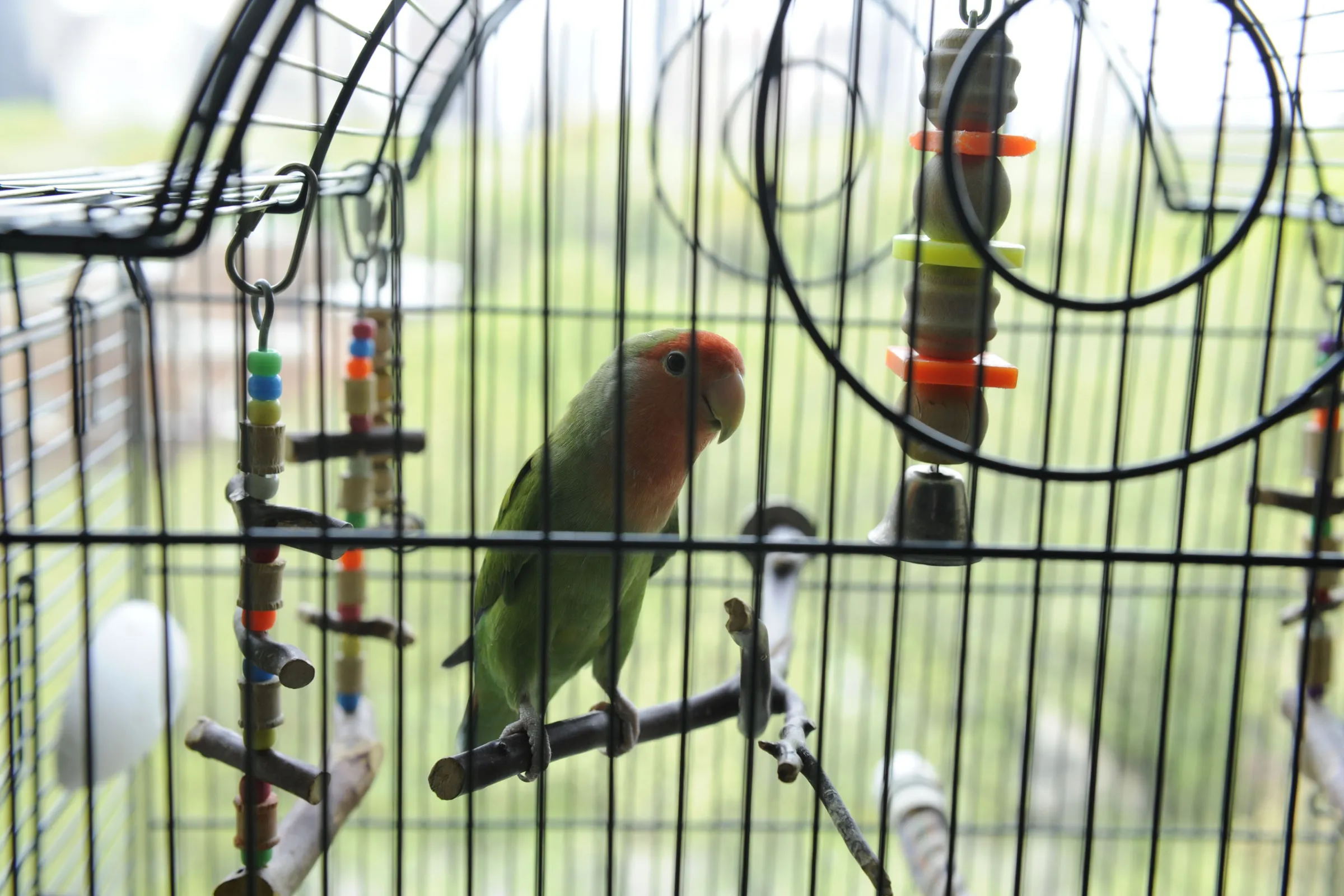 A lovebird in their cage at a New York City residence.