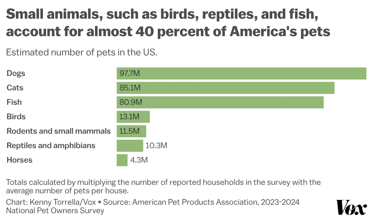 The article focused on dogs and cats, which make up the slight majority of the US pet population, but they’re just part of the story. Around 40 percent of America’s pets are small, largely wild or “exotic” animals — fish, birds, small mammals, amphibians, and reptiles — and they likely suffer far more than our canine and feline companions.