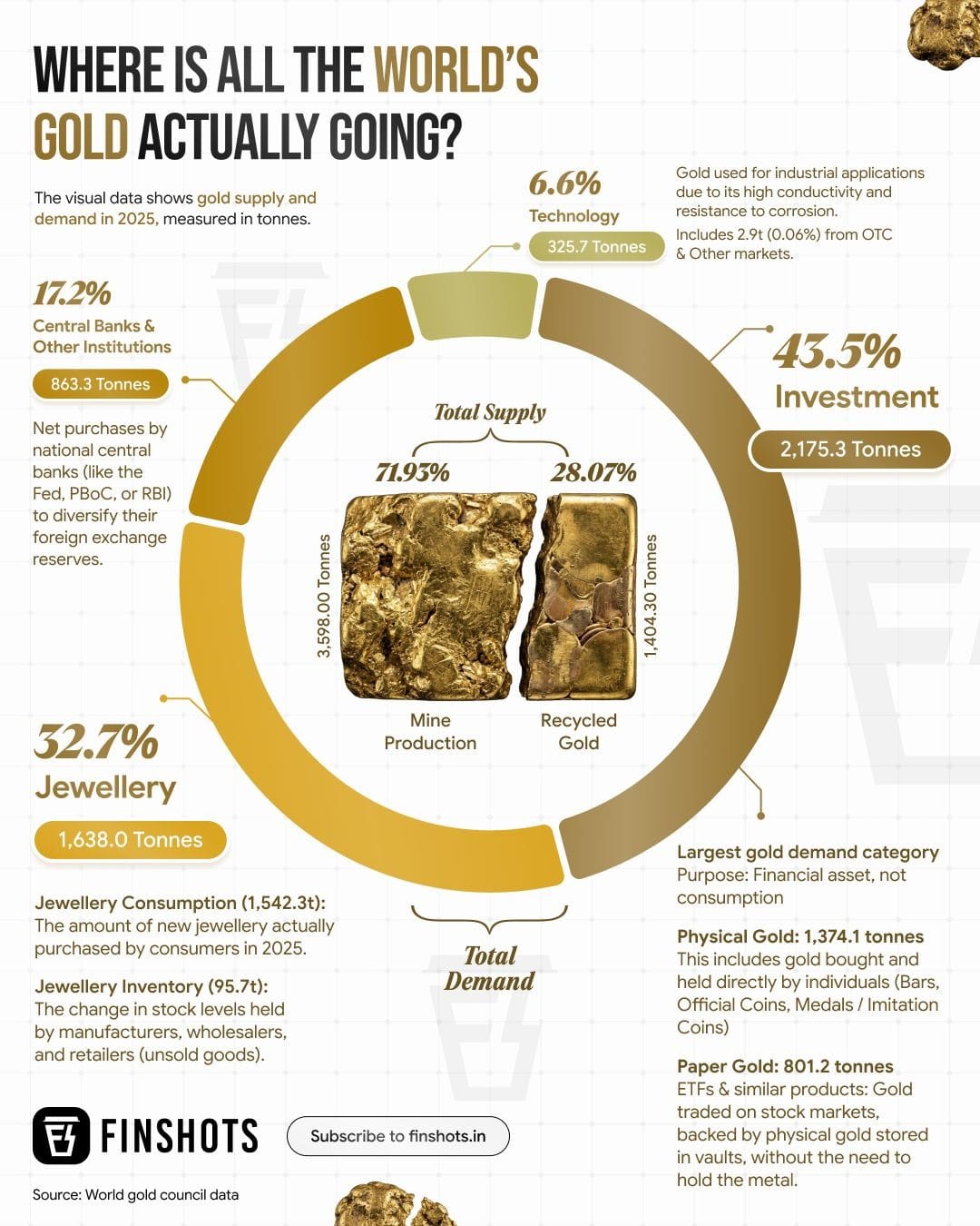 While we often associate gold with glittering jewellery, the data reveals that in 2025 the bulk of demand actually came from investors looking for a safe haven for their wealth.