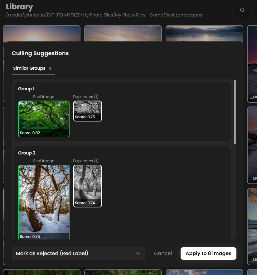 Here you see that there where 8 similar groups of images found. Every group shows the best image and the duplicates. You have the option to mark the images as rejected with a red label, set rating to 1 star, or move to trash. It did not found blurry images.
