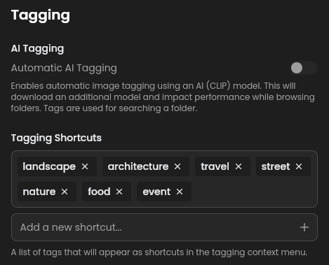 In the above screenshot you also see the option to enable automatic AI Tagging. This options enables automatic tagging using an AI model. When enabled, this will download an additional model to support automated tagging, but will impact the performance of the RapidRAW application.
