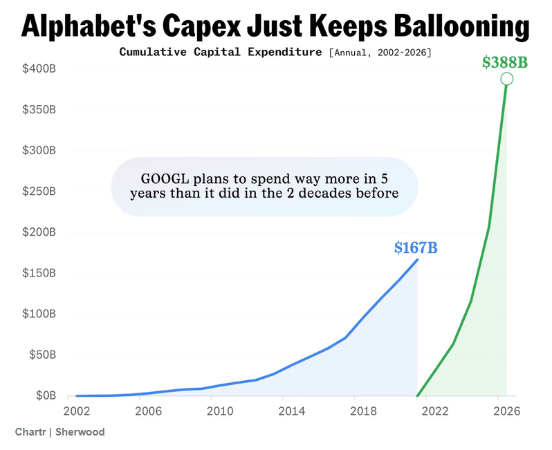 Alphabet plans to spend $185 billion in capital spending this year, largely on AI infrastructure, data centers and next-generation technology. Now sure, it generates more than $73 billion in free cash flow annually and has about $126 billion in cash on its books. But it cannot simply drain its reserves. These investments will span years, and he knows more funding will be needed along the way. In fact, its planned capital investment for 2026 alone will push up its total spending over the past five years to almost double what it spent in the two decades to 2018.